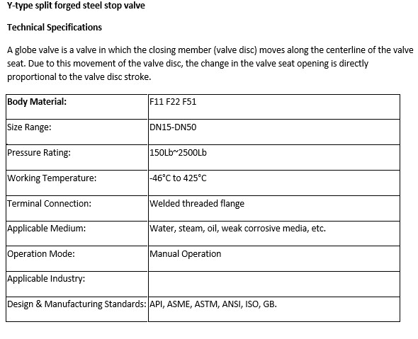 Y type split forged steel stop valve